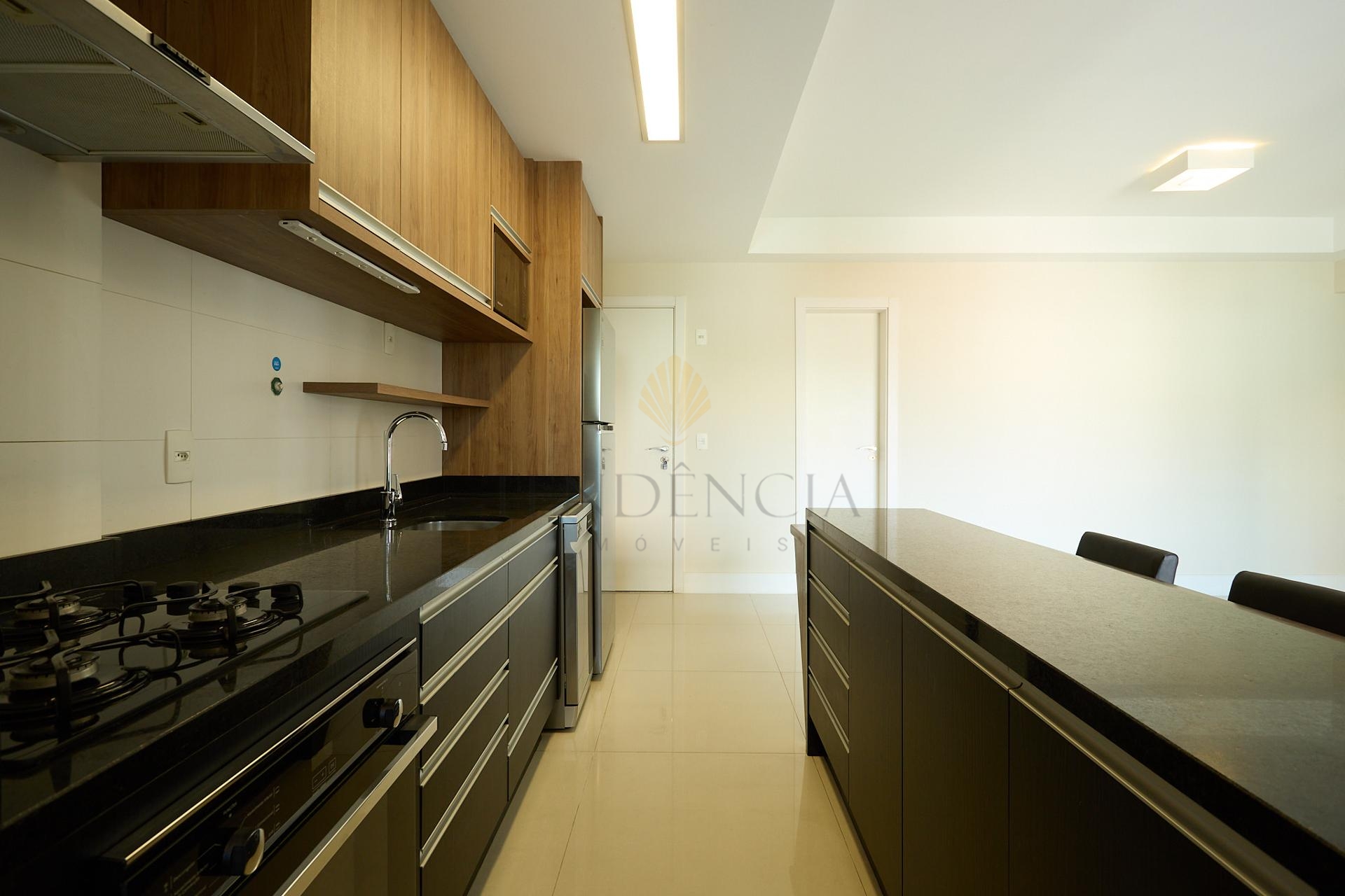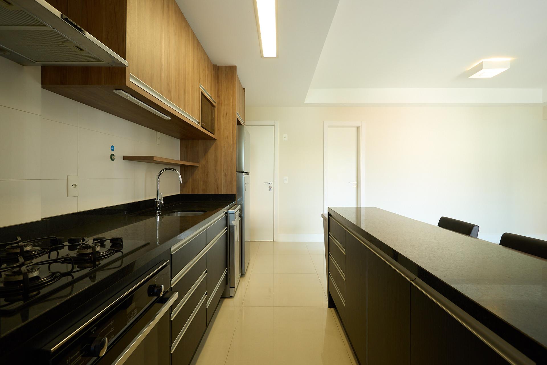 A cozinha em conceito aberto conta com armários planejados e eletrodomésticos, integrando-se de forma harmoniosa à área social.