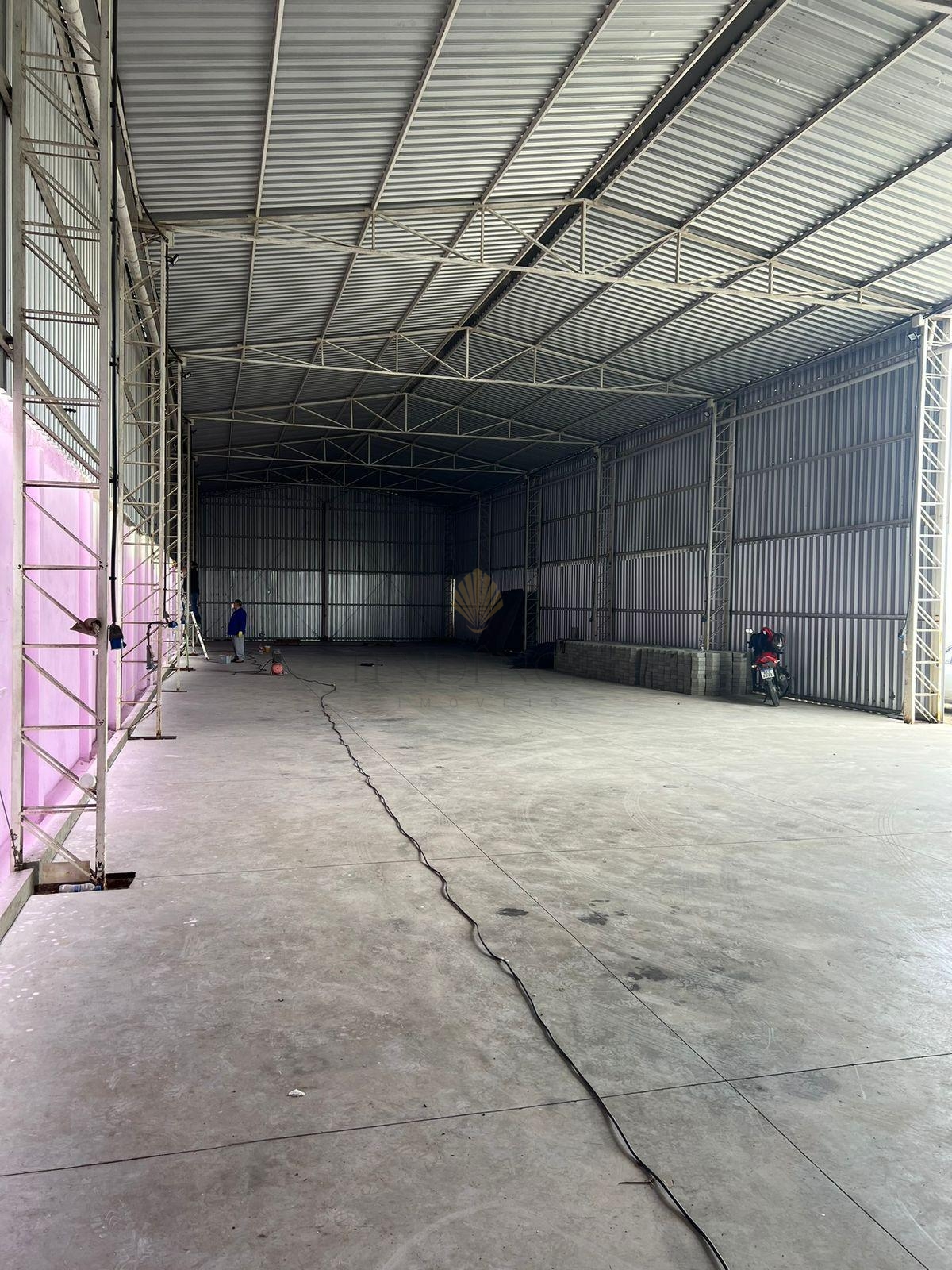O barracão permite tráfego de veículos pesados e conta com piso industrial em concreto 30 MPa (300 kg/cm²), com malha reforçada e