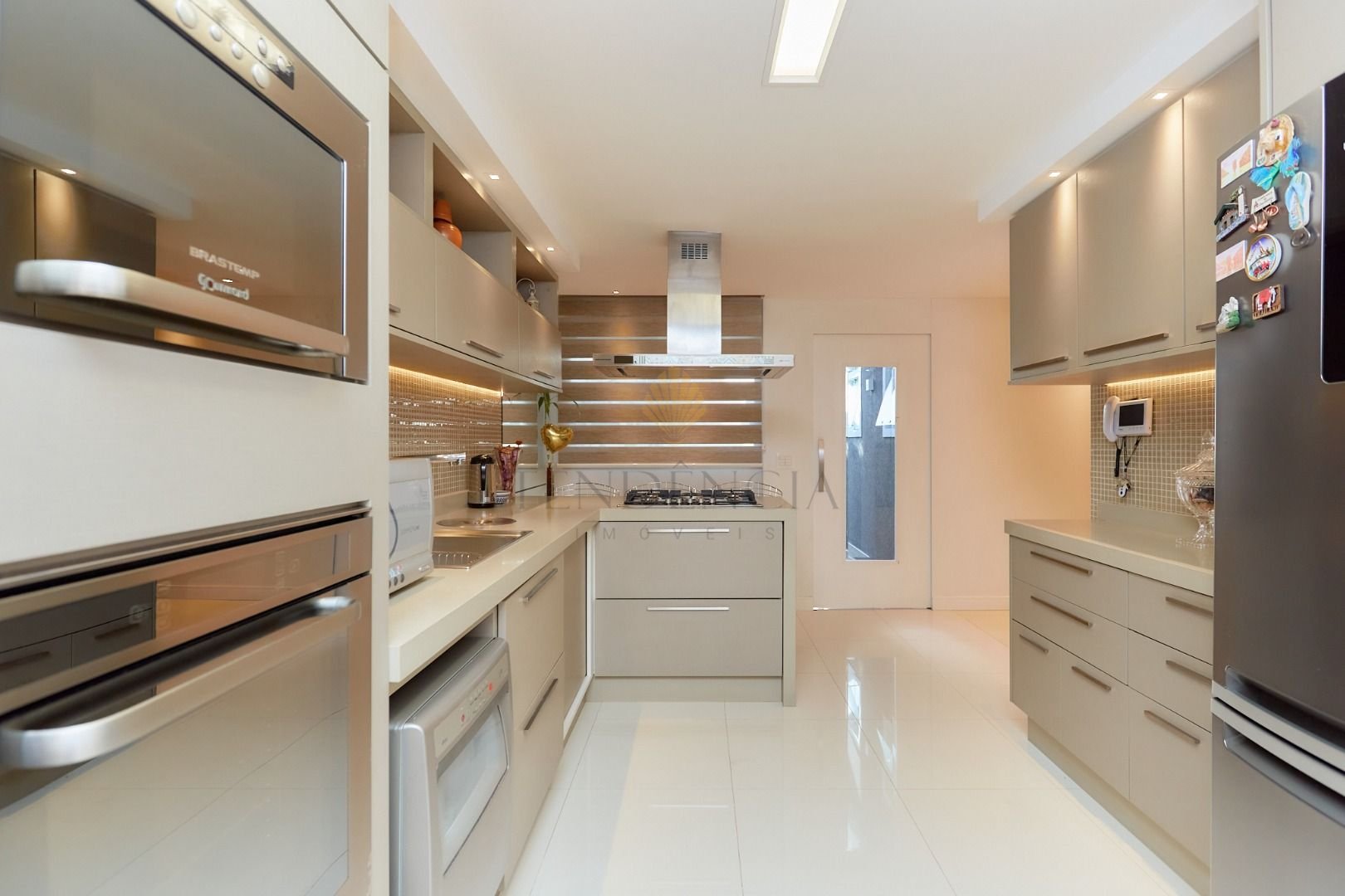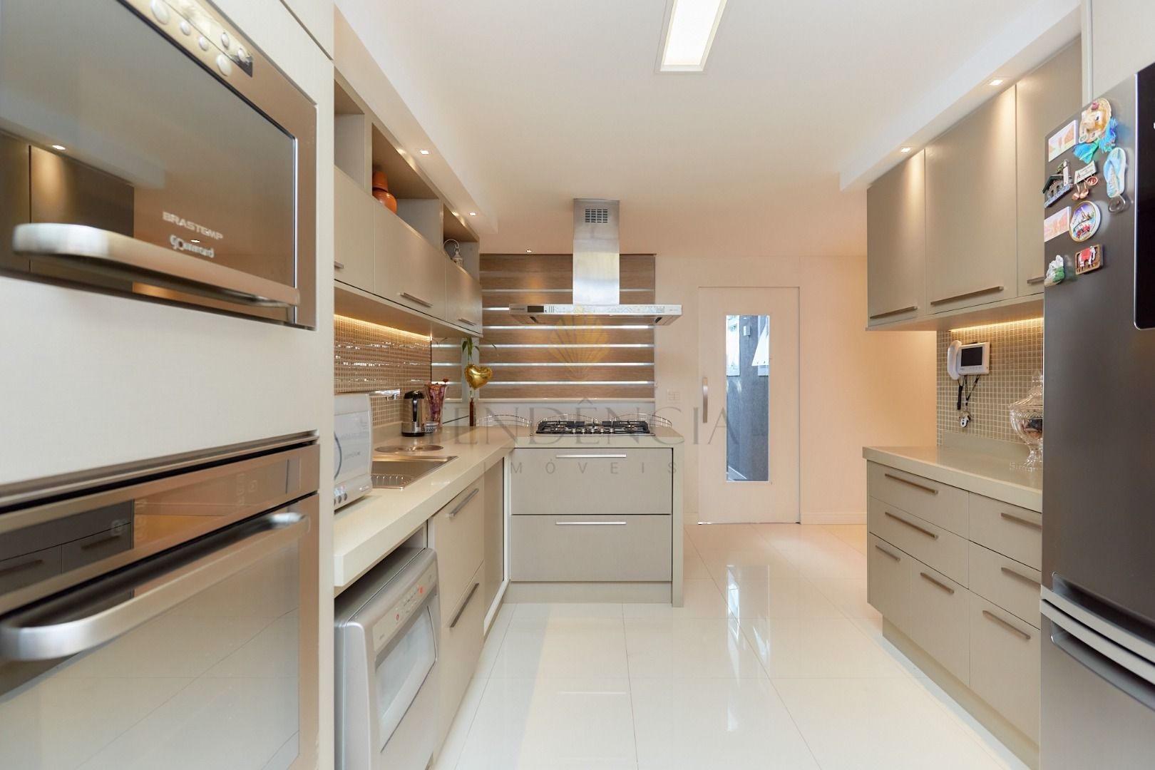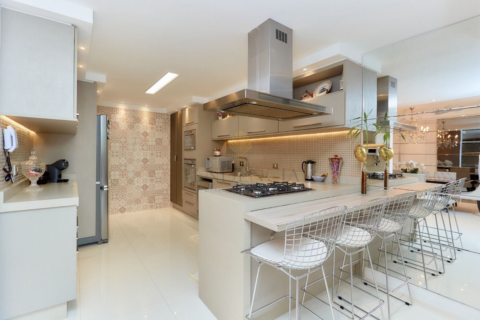 O hall de entrada com paisagismo impecável dá as boas-vindas, enquanto a cozinha mobiliada oferece praticidade no dia a dia.
