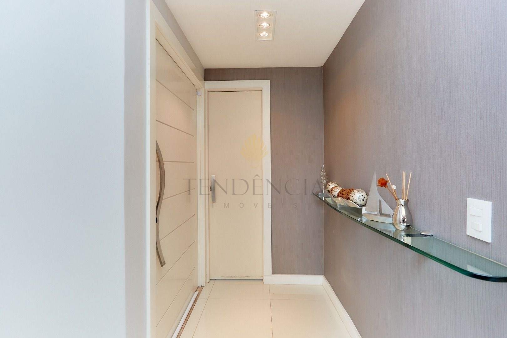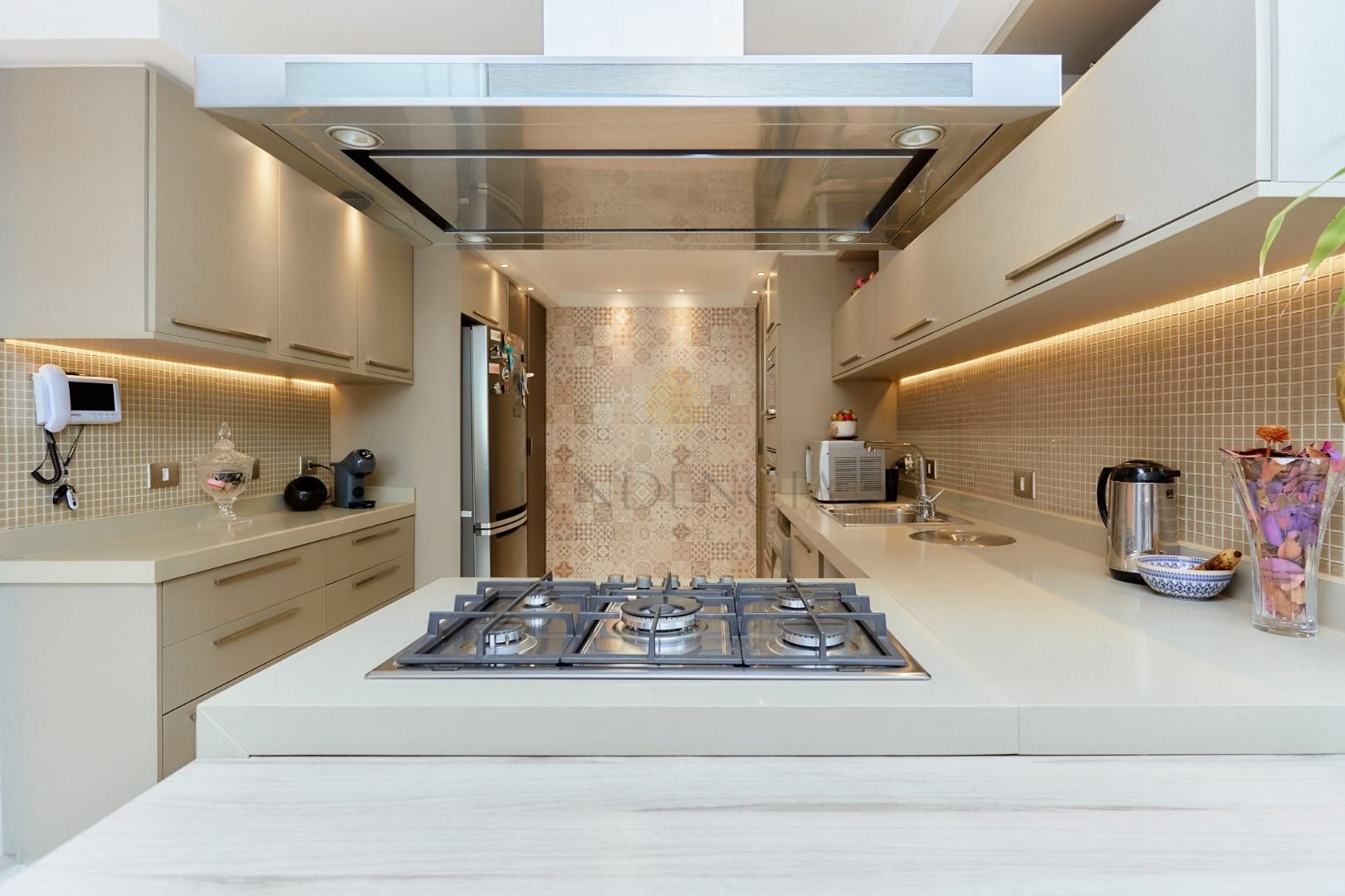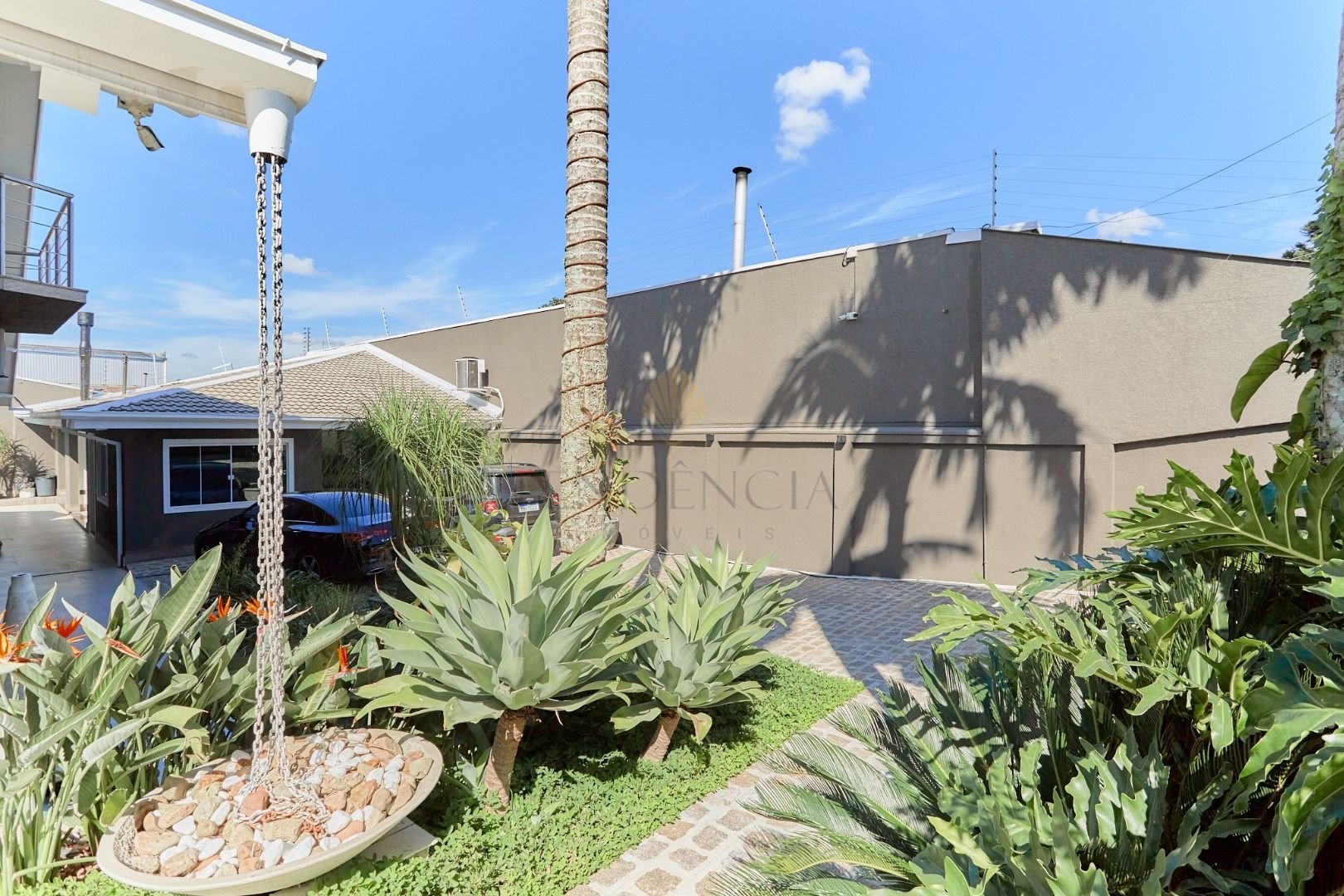 O hall de entrada com paisagismo impecável dá as boas-vindas, enquanto a cozinha mobiliada oferece praticidade no dia a dia.