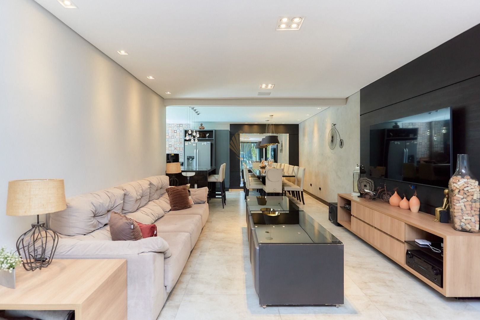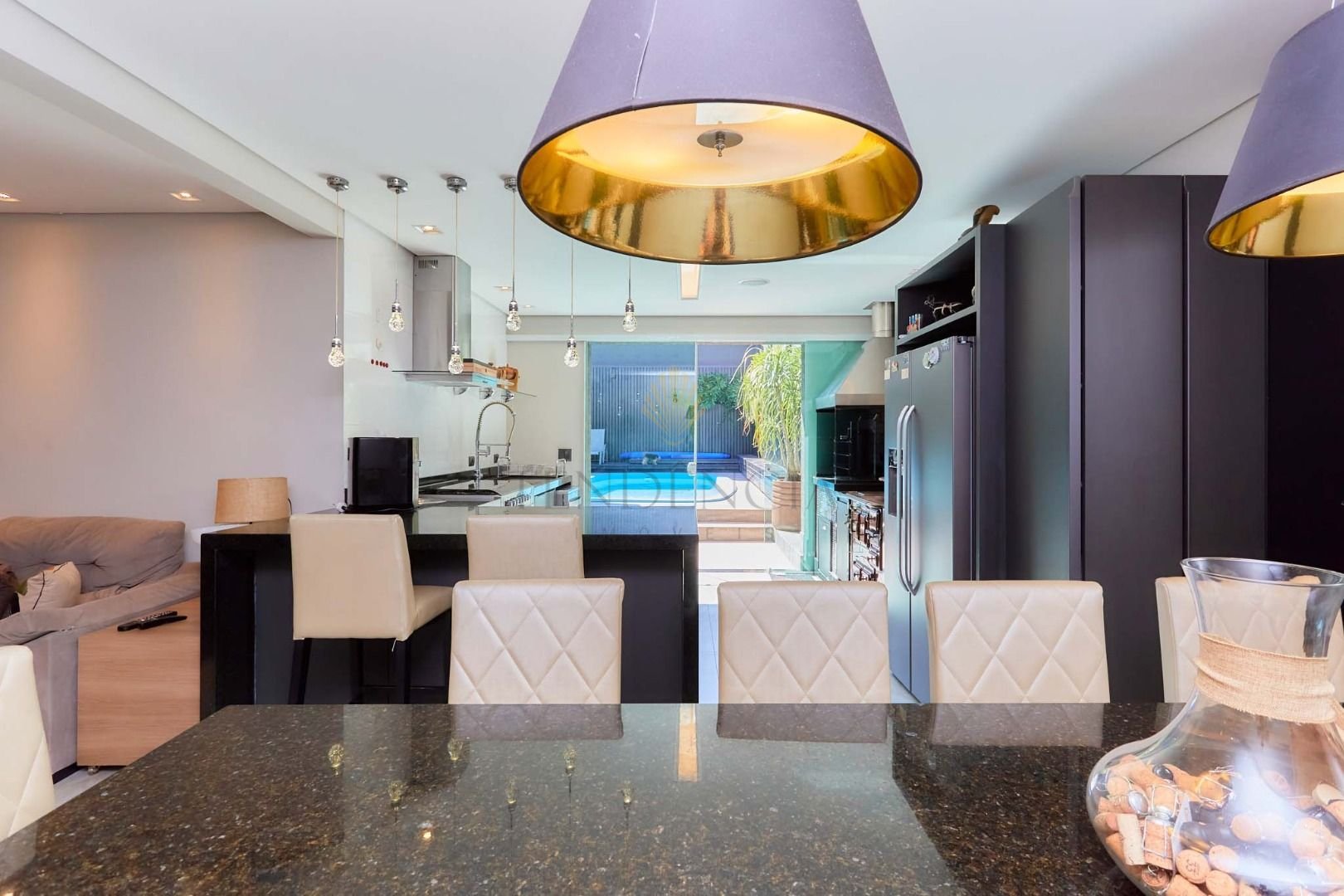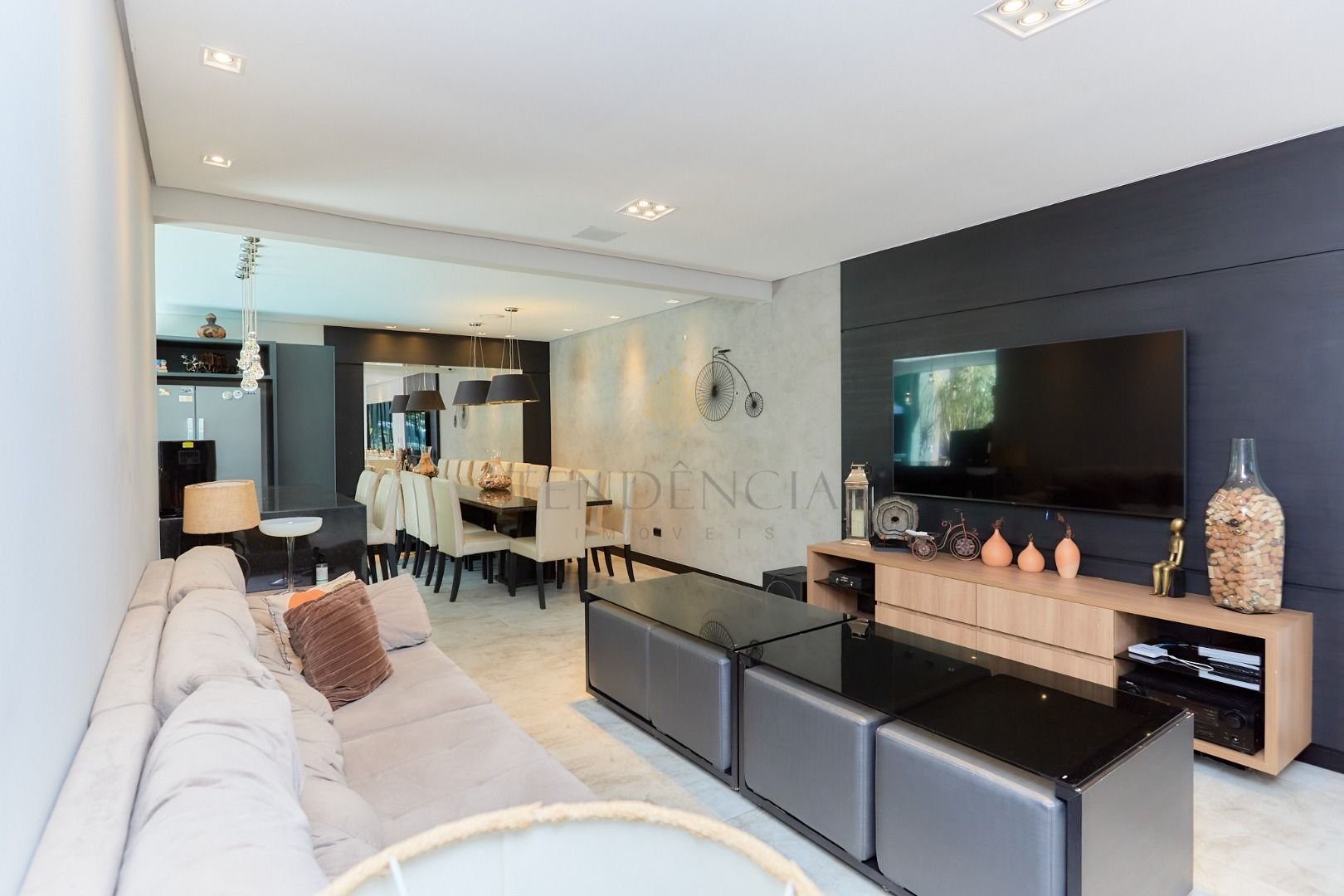 Com projeto arquitetônico em conceito aberto, o living se integra de forma harmônica à área gourmet, criando um ambiente acolhedor e perfeito para receber.