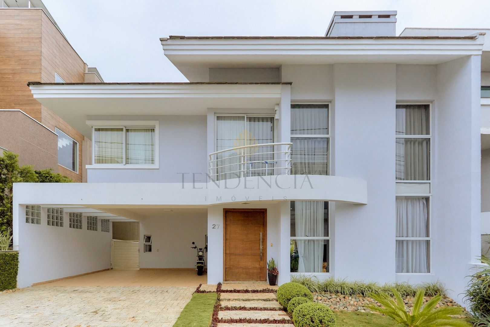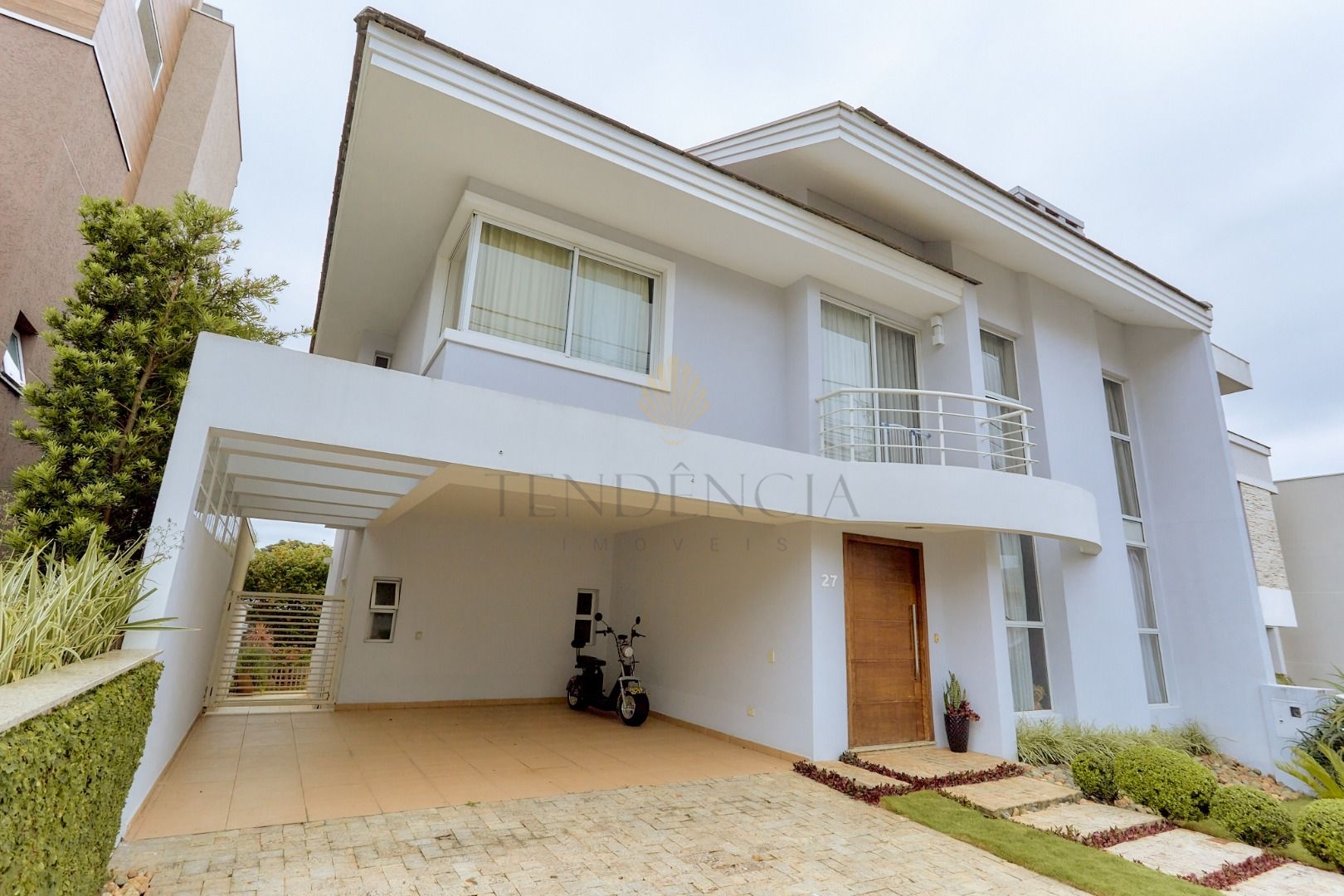 A residência conta com uma garagem para 4 veículos, sendo 2 vagas cobertas e 2 vagas descobertas.