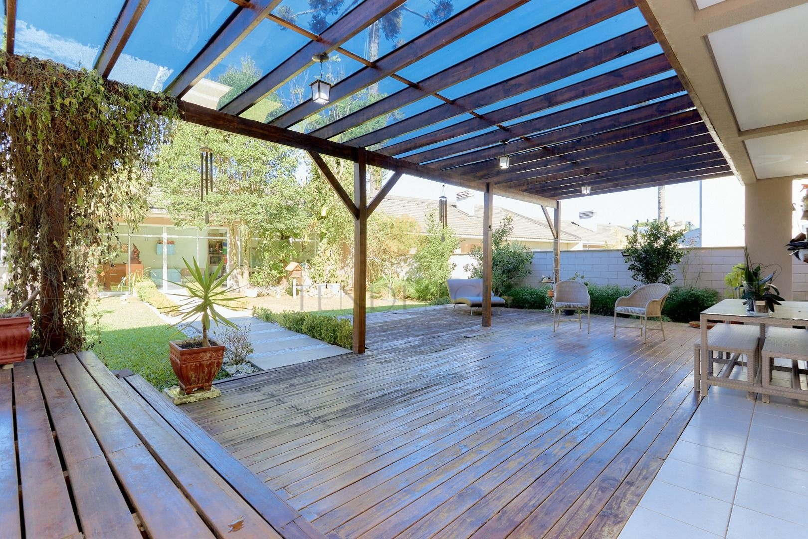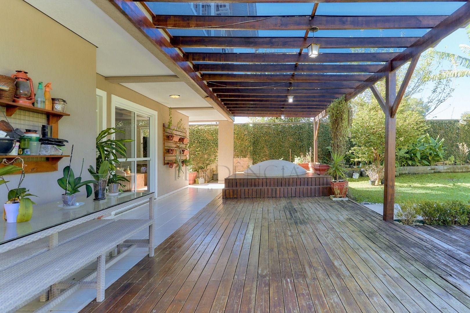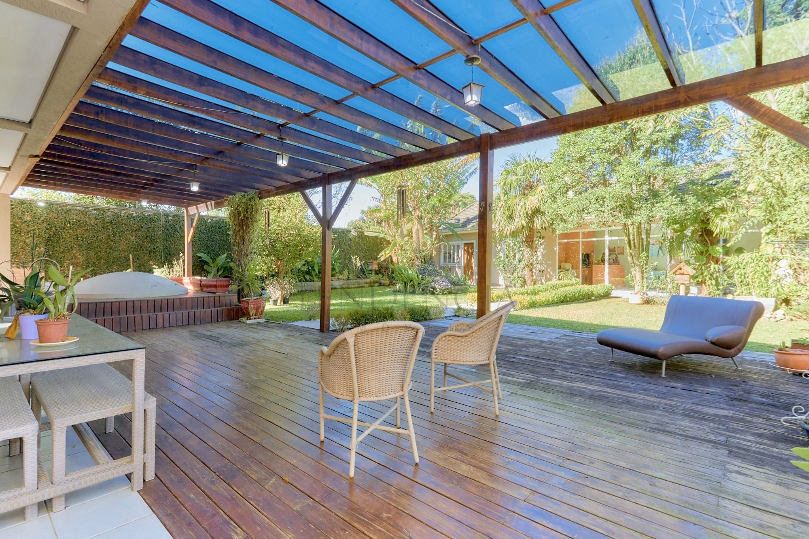 Em um espaço mais reservado encontramos uma biblioteca e uma sala de tv que dão acesso ao deck e um grande e agradável jardim. Aos fundos desse jardim, temos um espaço com churrasqueira, banheiro e mais 2 cômodos que podem ser transformados em uma Maravilhosa Área Gourmet.