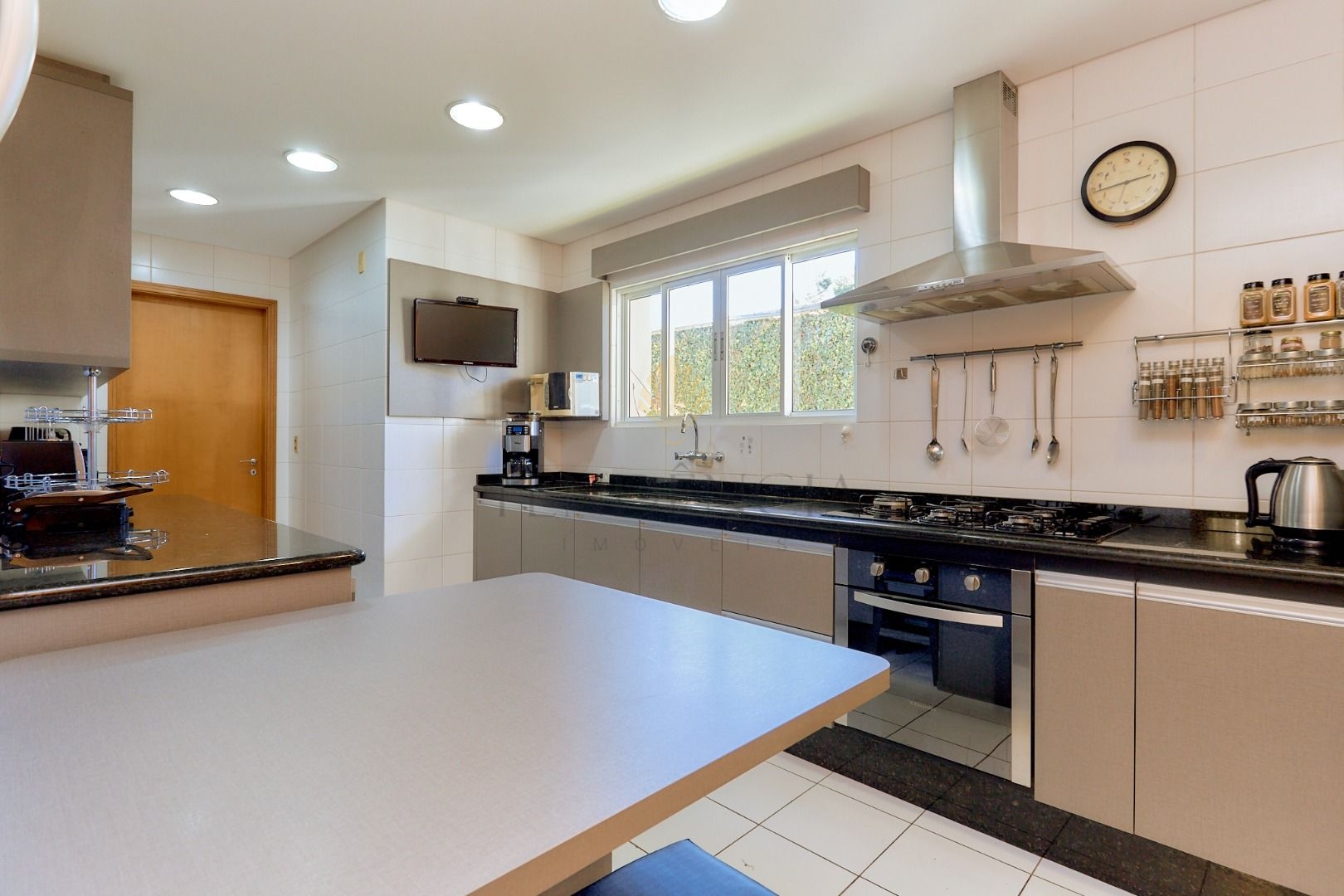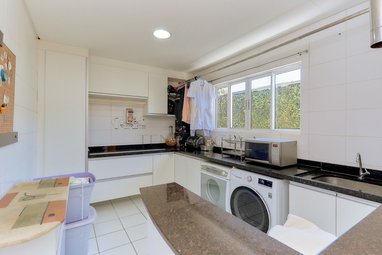 A cozinha é espaçosa e com muitos armários. A lavanderia planejada é independente.