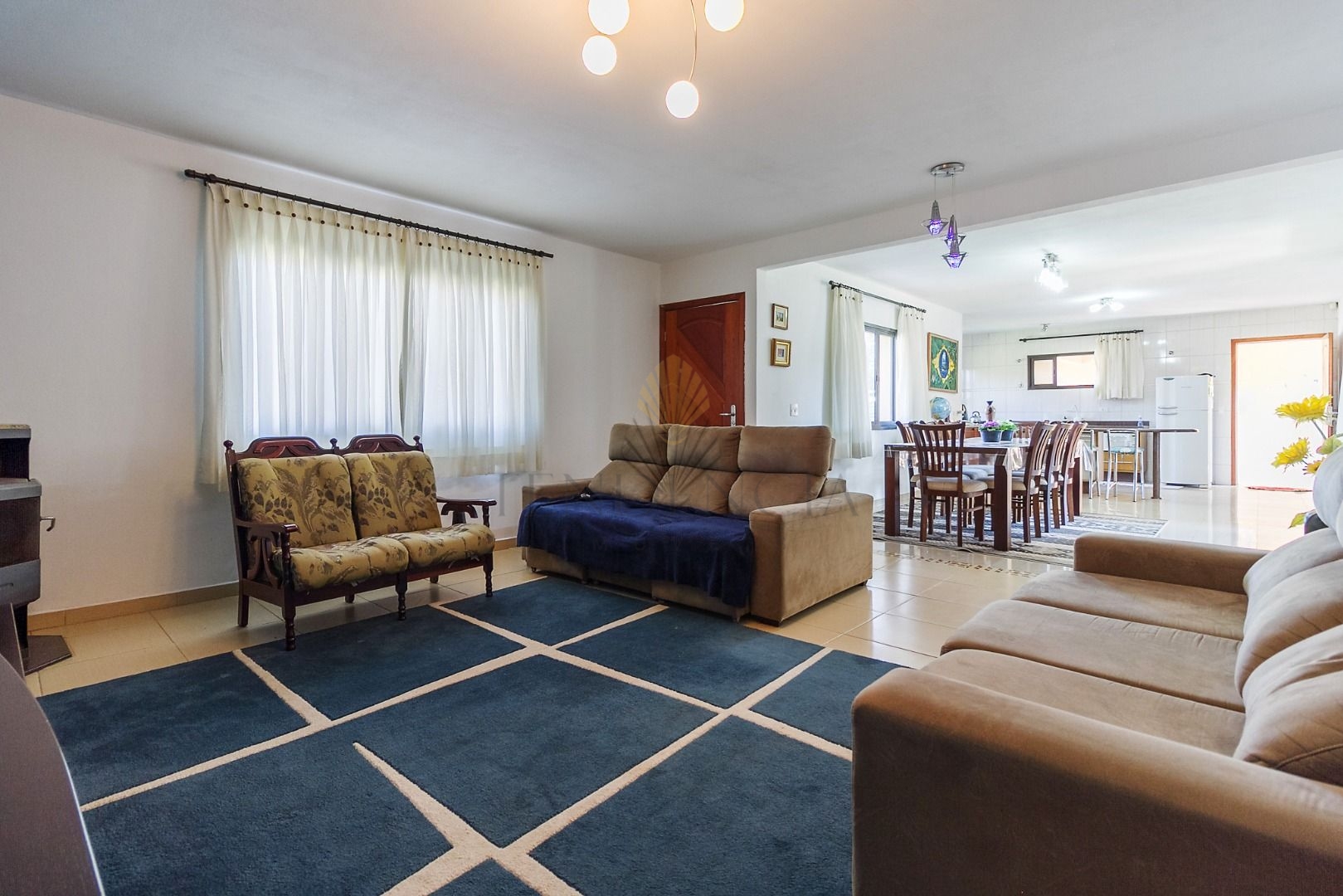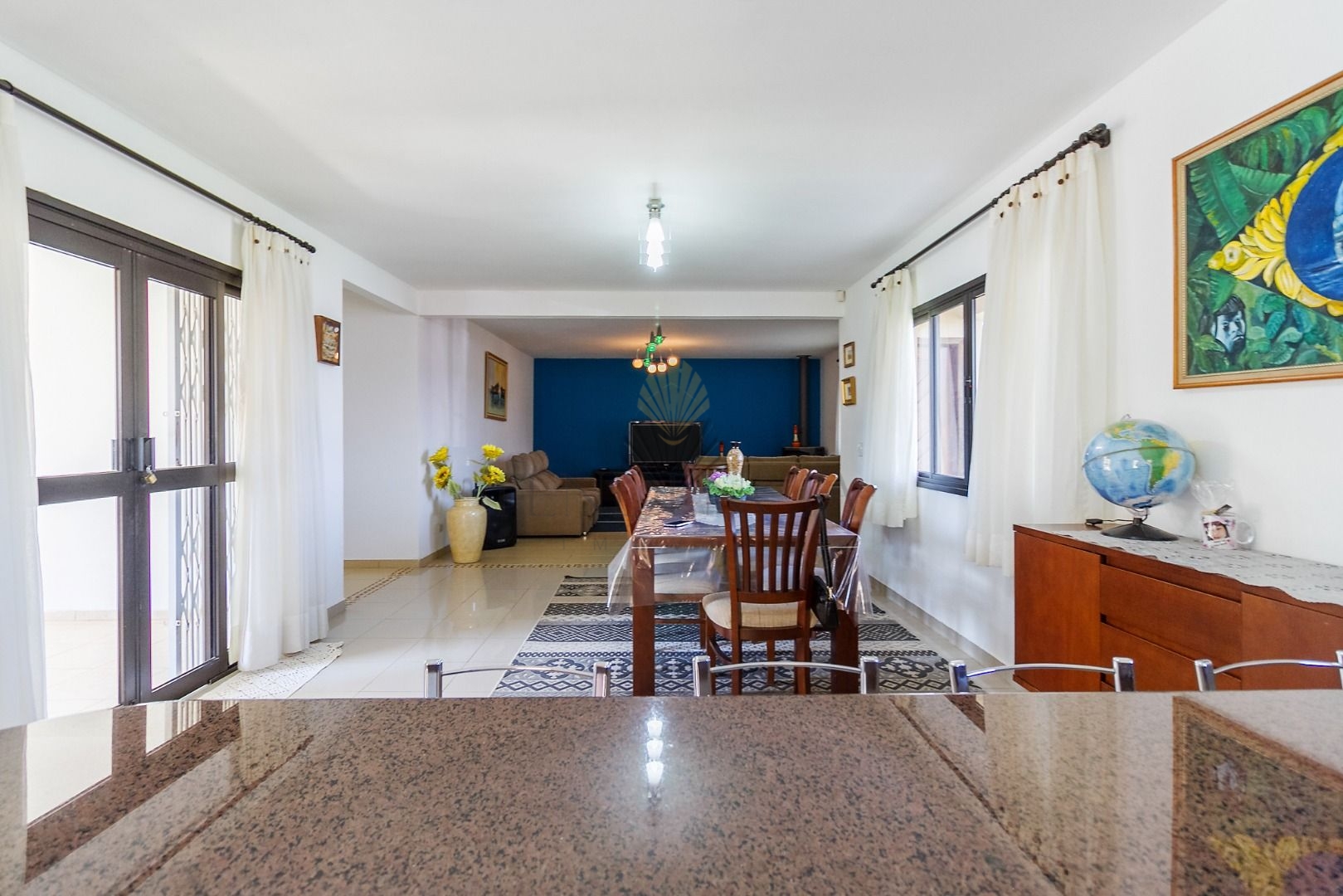 Ambientes integrados de sala de estar, jantar e cozinha