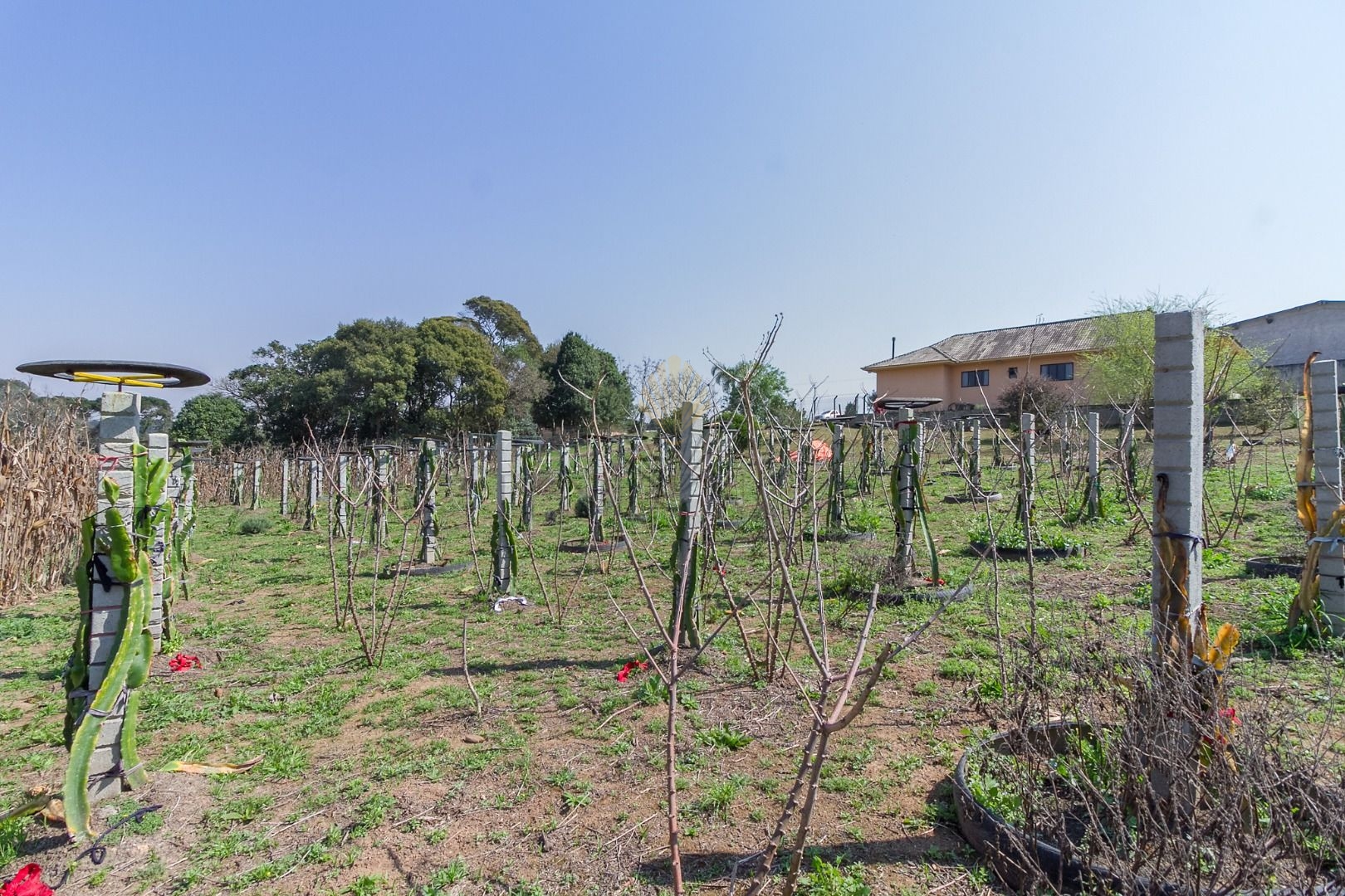 O terreno de 3.000 m² oferece bastante área livre, atualmente com cultivo de pitaya e outras árvores frutíferas, possibilitando diferentes usos, como lazer, plantio ou futuras melhorias.