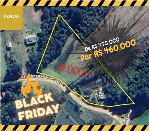 Esta chácara de esquina, toda cercada, conta com 10.000 m² de área total, em terreno praticamente plano - ideal para novas construções, cultivo, lazer ou criação.